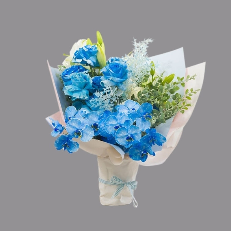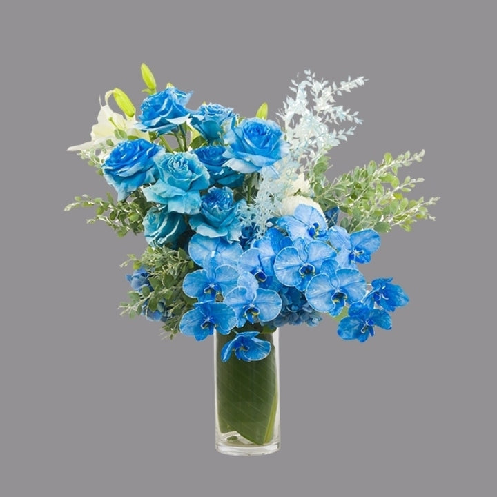 Bring elegance to any moment with our Sky Blue floral arrangement — a grand display of blue Colombian roses, orchids, lilies, and lush white mums.